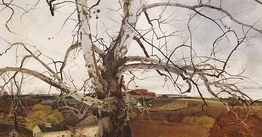Woke up far from home today on Thanksgiving (Japan-time), but art provided comfort that dreaming of mom’s homecooked feast could not. Today’s newsletter explores Andrew Wyeth and the quiet comfort of the pastoral. Please enjoy some autumnal writing!
