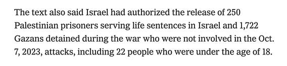 The New York Times still can't dare admit that Israel holds Palestinian children as hostages. In today's article they yet again refer to Israel releasing "22 people who were under the age of 18."