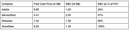 Given the huge SBC issued by Atlassian and Snowflake, these companies cannot support their stock prices through stock buybacks (since most of the buybacks will get consumed in buying back stock issued for SBC).