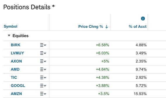 Birkenstock is up 6.5%, and LVMH is up 6%. You can see the trend hold even with the biggest companies — Both Amazon and Google rose more than the index.