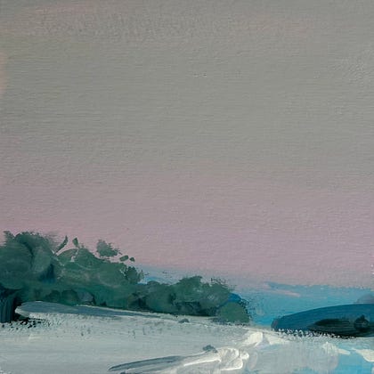 Back to my 10 stroke gouache winter scenes. This small painting came straight from imagination, leaning into a dream like color palette as a way to loosen the scene and let it drift toward abstraction. I was less interested in describing a specific place and more in suggesting a feeling, something half remembered or just about to fade.🌟…