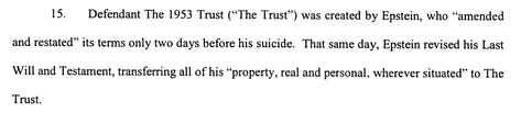 Jeffrey Epstein amended his will and the benefactors of his 1953 Trust (where we got the Birthday Book and the emails) two days before his death.