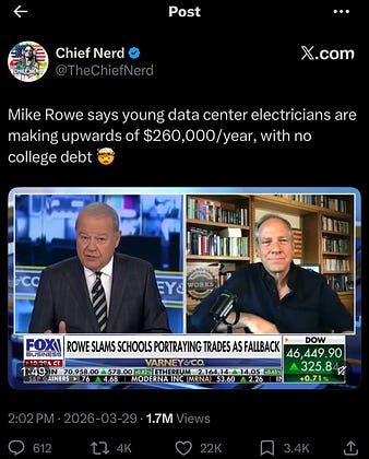 To be clear, trades can be fantastic. I know a man who left a promising law career to become a roofer; he owns his own business, and only works in the summer, clearing six figures easily.