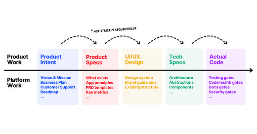 Every feature starts as some simple intent in a PM’s mind, then gets passed down to various levels of specs (product, UI/UX, tech), until it becomes actual code.