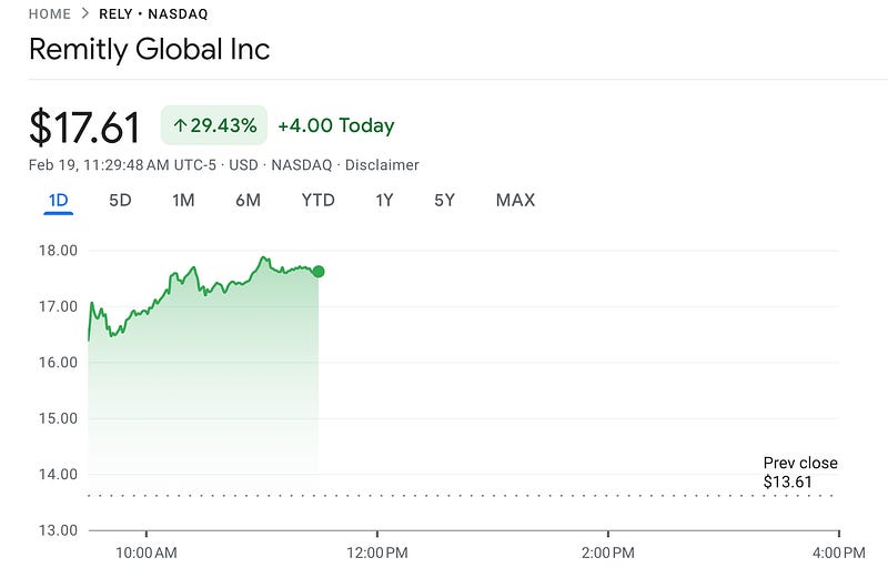 Big up day for Remitly Global Inc. - +29%!