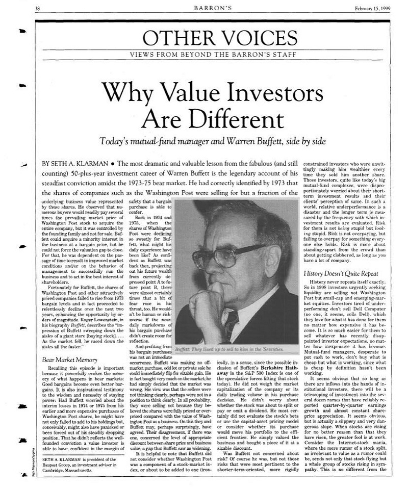 In Feb 1999, Seth Klarman wrote this article for Barron's. The Nasdaq was mooning, and value investors looked like dinosaurs.