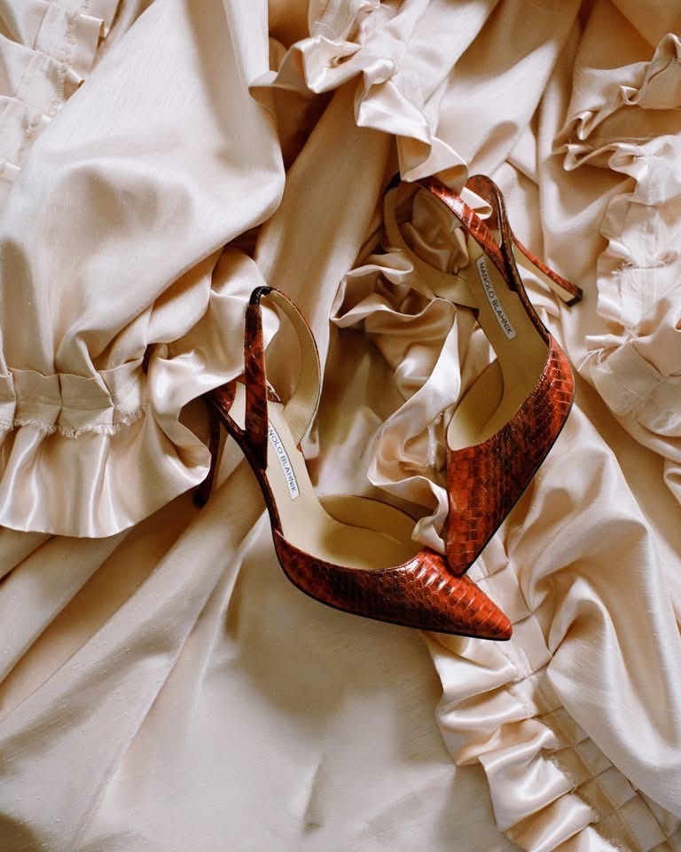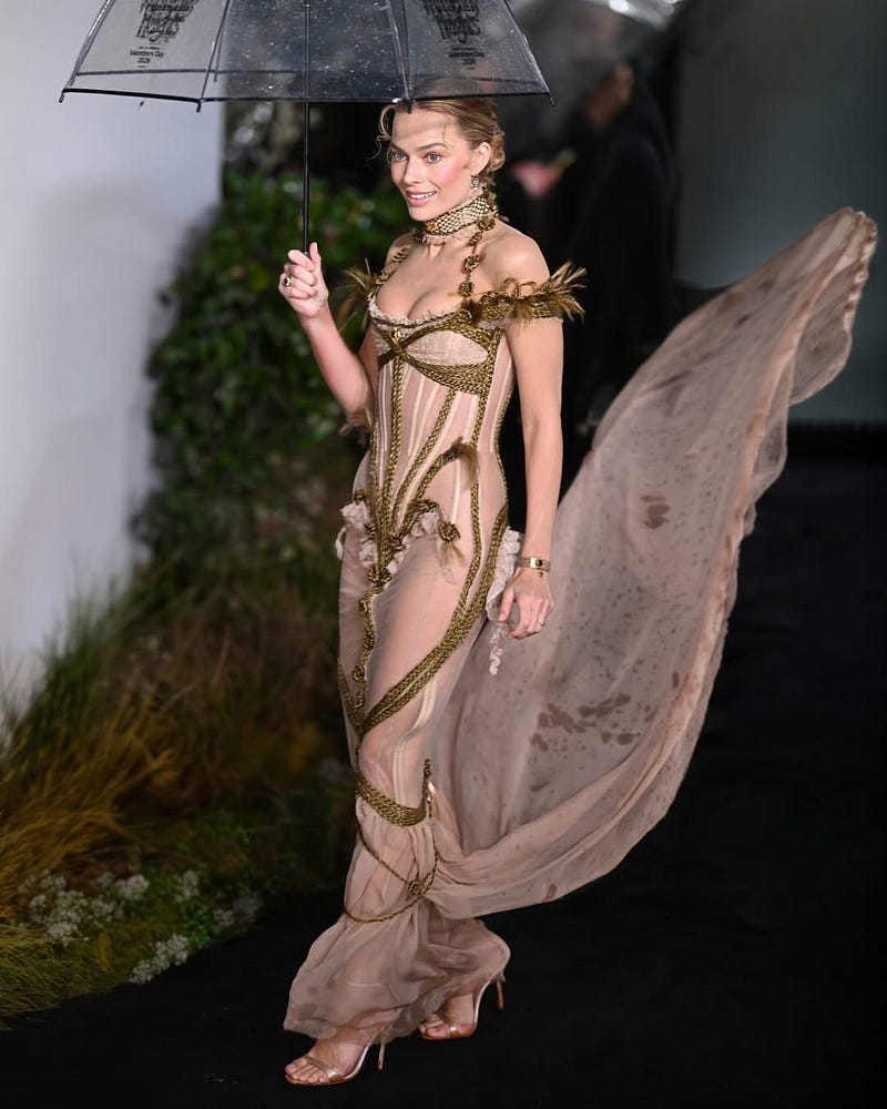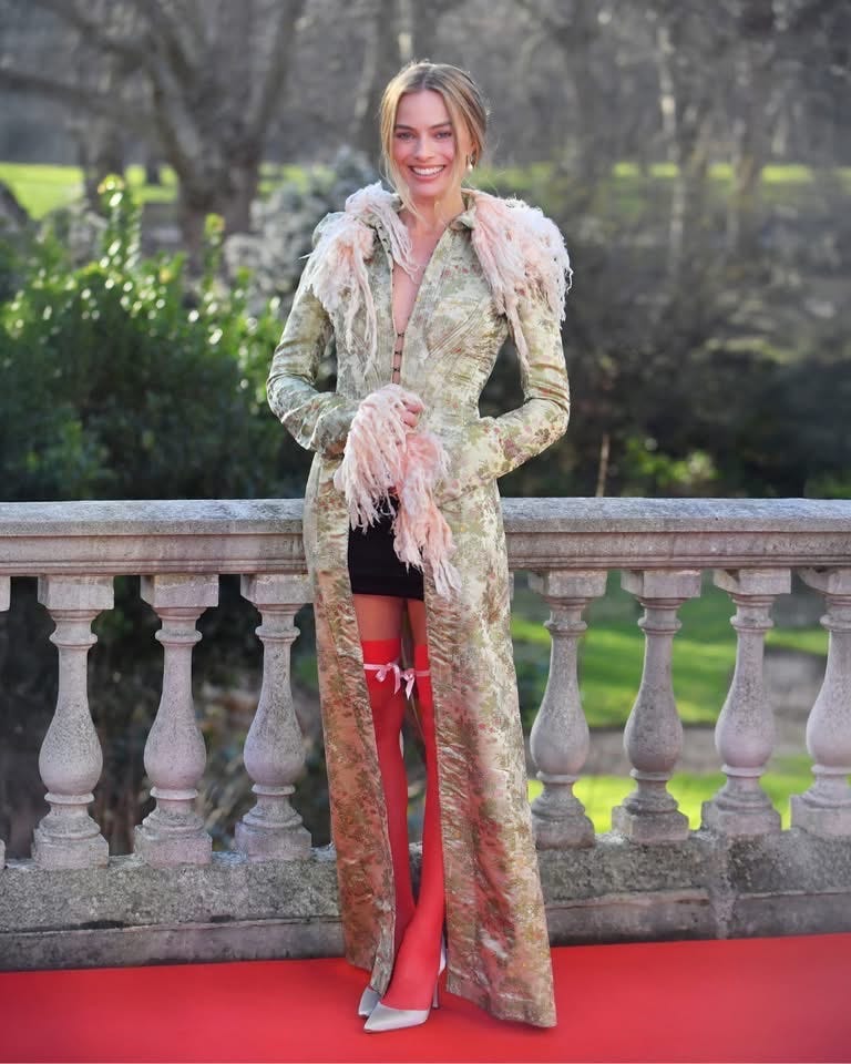Margot Robbie wears bespoke Manolo Blahnik styles for the 'Wuthering Heights' Press Tour.
