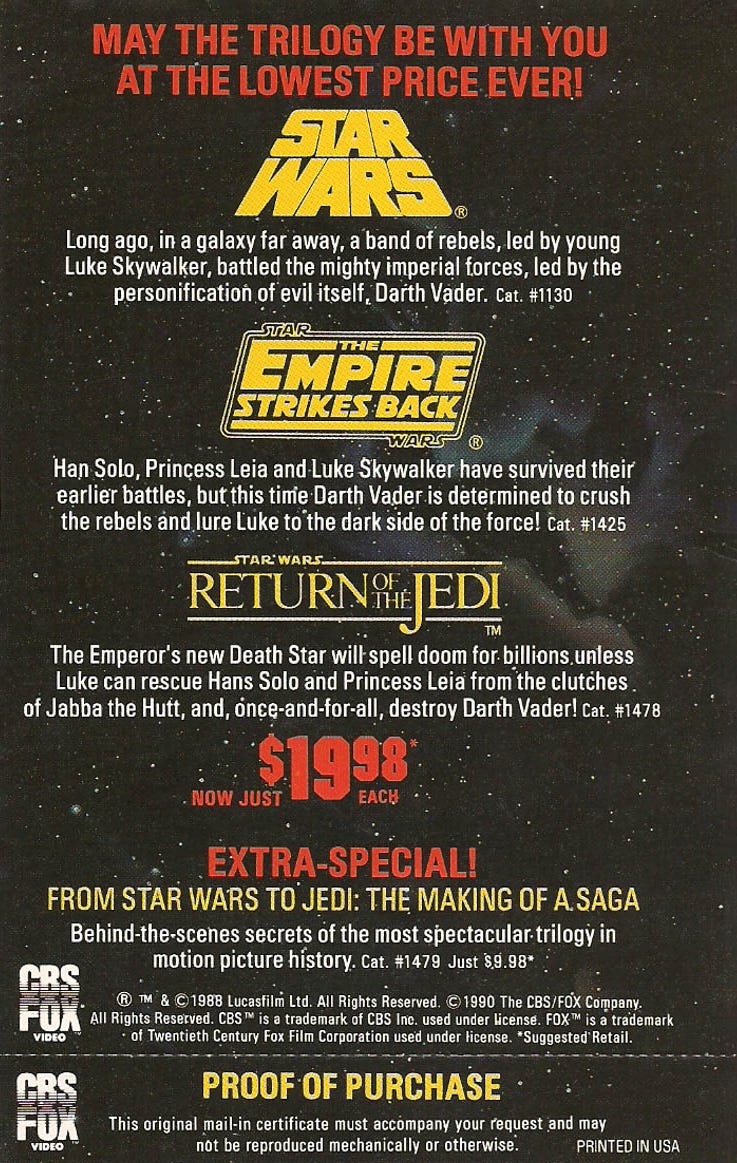 The proof of purchase insert from the Star Wars Trilogy VHS Release.
