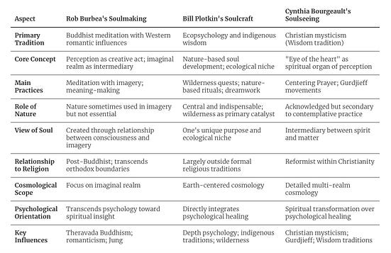 Appreciate this comparative analysis that Stephen has brought together—though, as is common with AI-assisted summaries, there are some subtle and valuable points that I think get lost (e.g., I see Cosmospoesis, where open-eyed and world-facing perception becomes archetypally saturated, as a deeper striving of Burbea’s teachings rather than an occasional sideline).