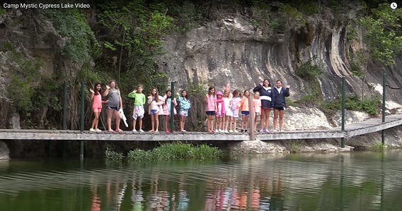 The most haunting scene I’ve come across in examining the catastrophic losses from the Kerry County Texas flood is this image from a promotional video for Camp Mystic. Look at the power of water etched into the rock behind them.