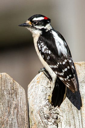 This is the Downy Woodpecker (Dryobates pubescens), the smallest woodpecker in North America. This bird’s range spans most of the continent. This 5-7 inch bird is considered a symbol of bravery and has inspired many legends.