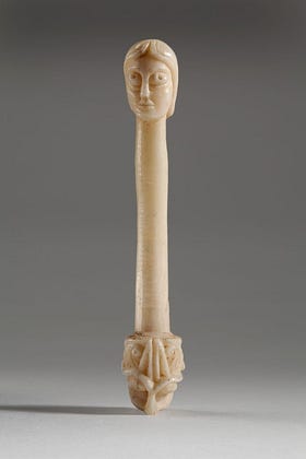 An exquisite little thing: 12th century walrus ivory bobbin found in Norwich castle, likely the property of a wealthy noblewoman. While such objects had a practical use in needlework, this one is very polished and more than anything showcases the fine artistry surrounding the details of the Romanesque human and dragon head.