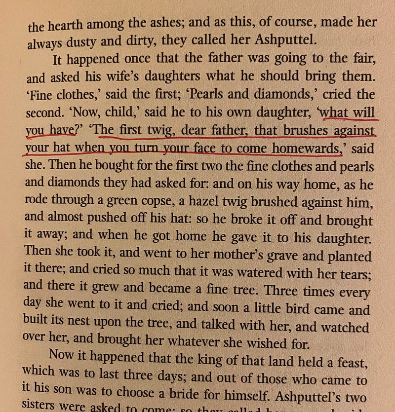 when i read cinderella (brothers grimm version), i was wonderstruck by a scene in which cinderella asks her father for a twig as a gift from his travels.