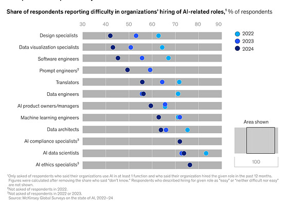 According to a recent State of AI McKinsey study, fewer respondents reported difficulties in recruiting for these positions compared to previous years.