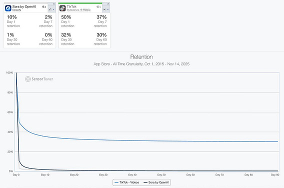 This graph shows Sora is struggling to retain users with 30 day retention rates of less than 1% - far less than TikTok’s 30%.