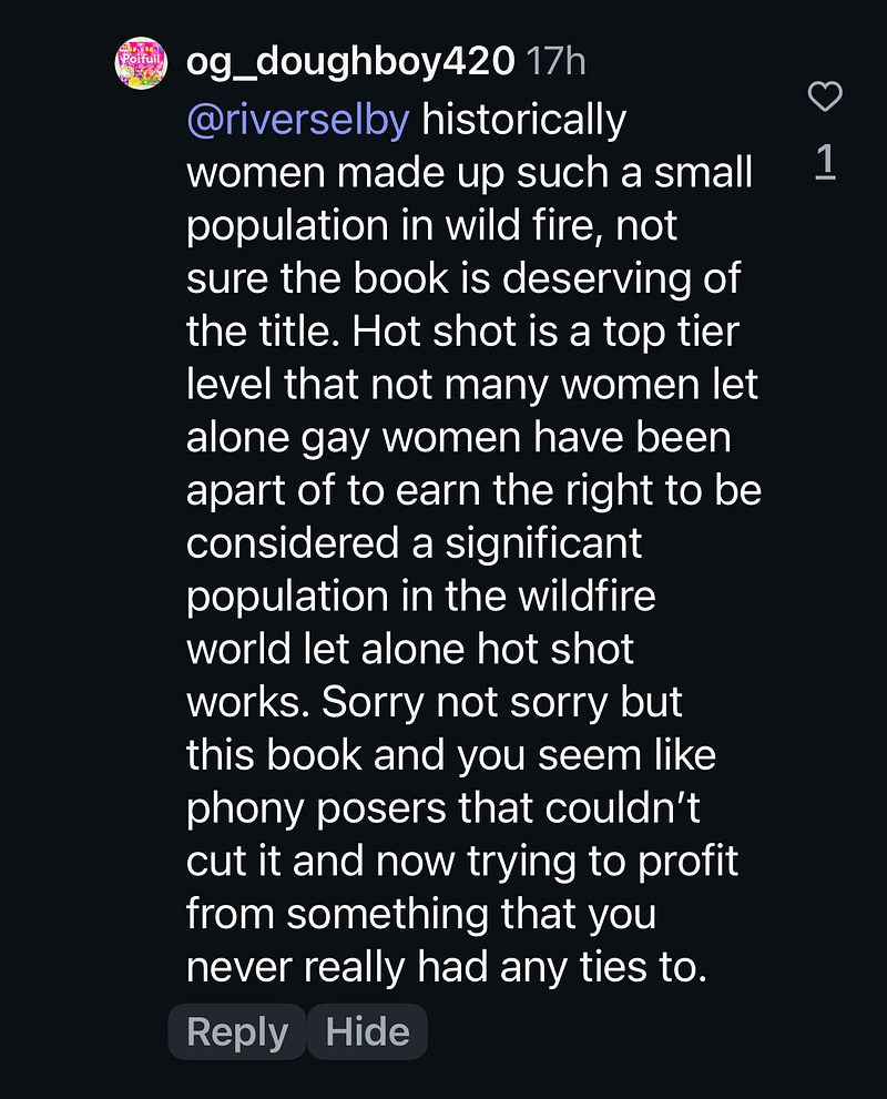 Love this comment someone left on my instagram about my debut memoir, HOTSHOT, which demonstrates exactly the kind of dudes I had to deal with while working as a hotshot. And now. And forever. Men write about fire and they get accolades and awards. I write about fire and I get to interact with the men who made me hate the job of firefighting…which was a job I loved.