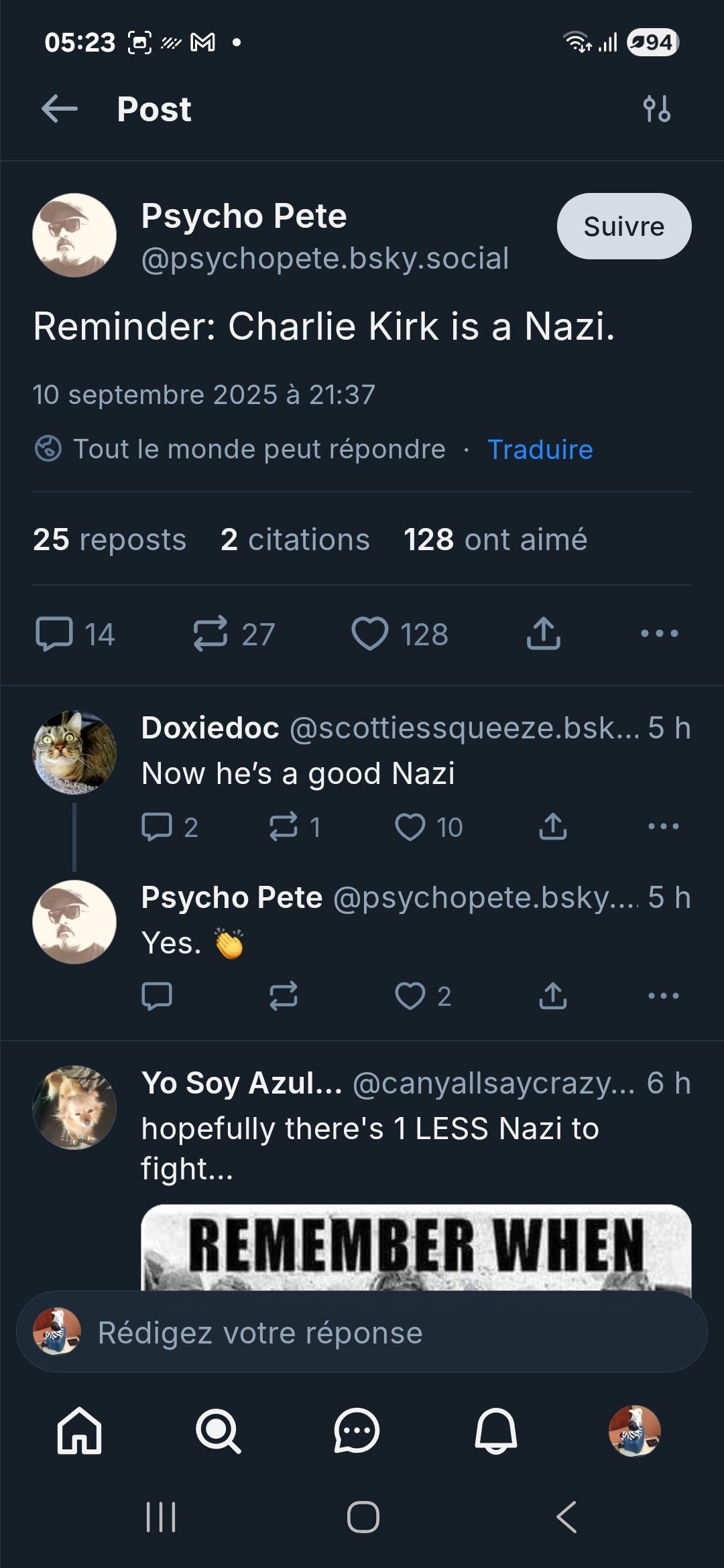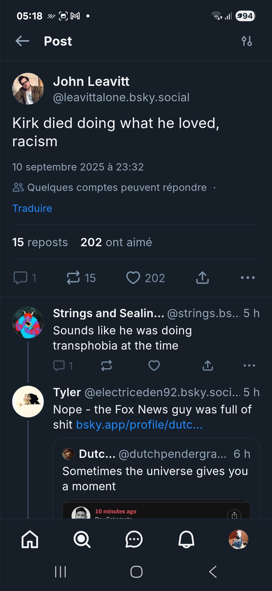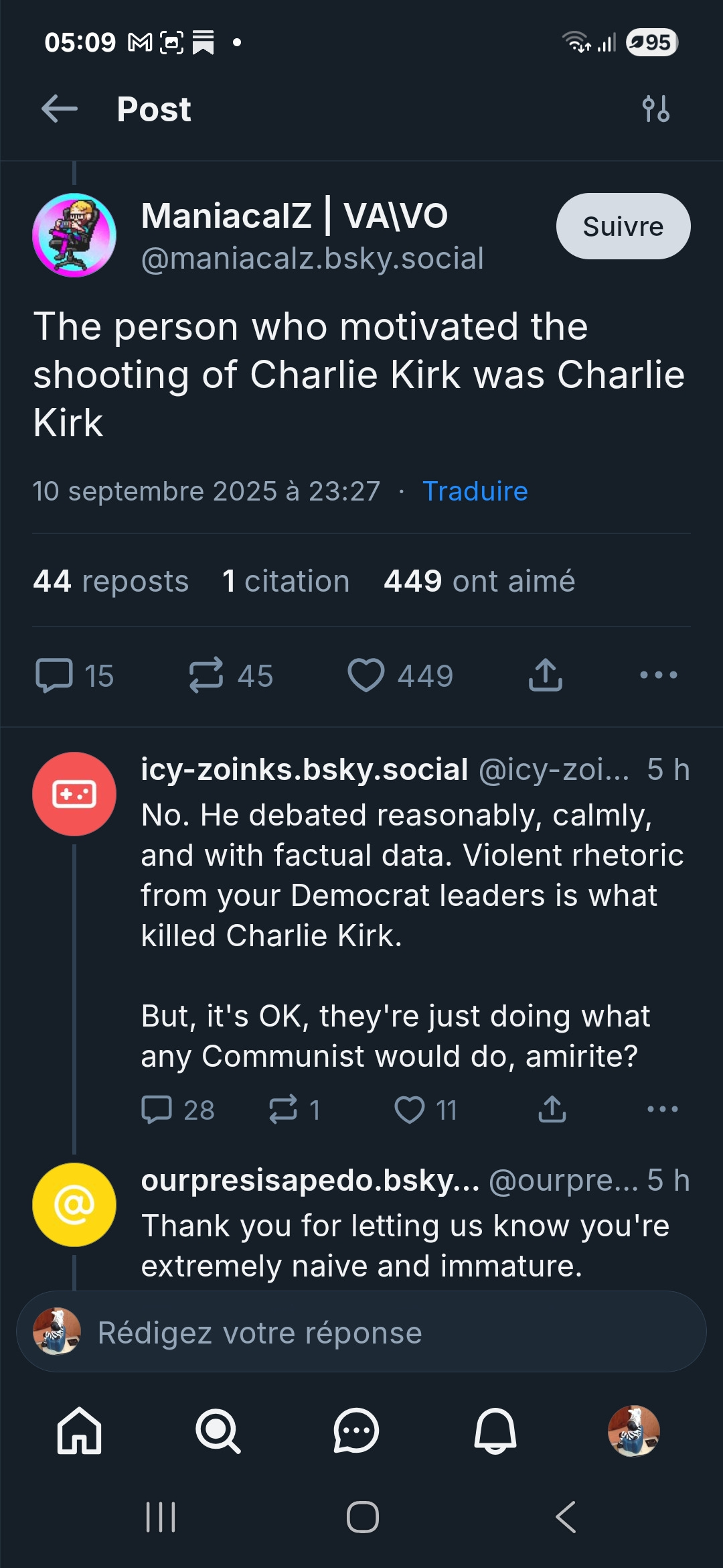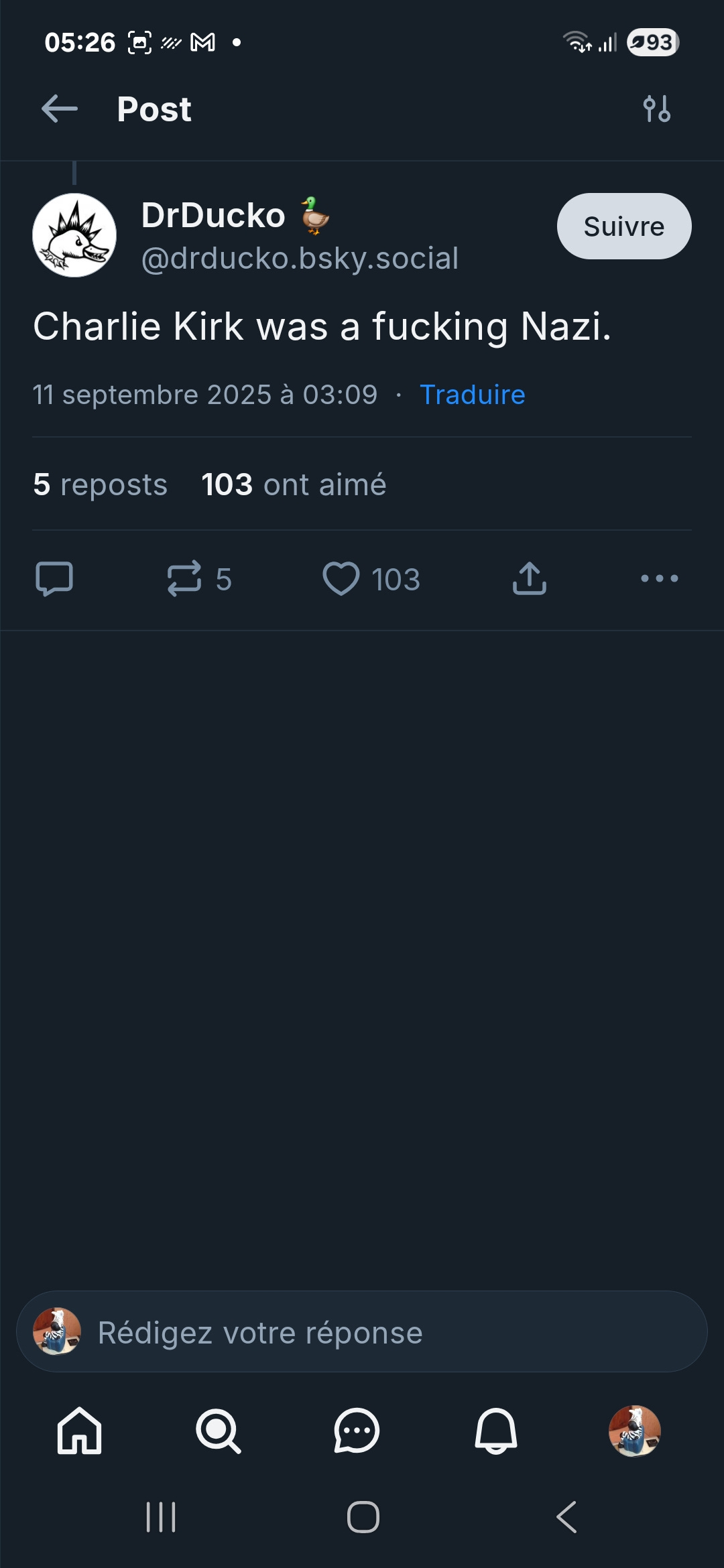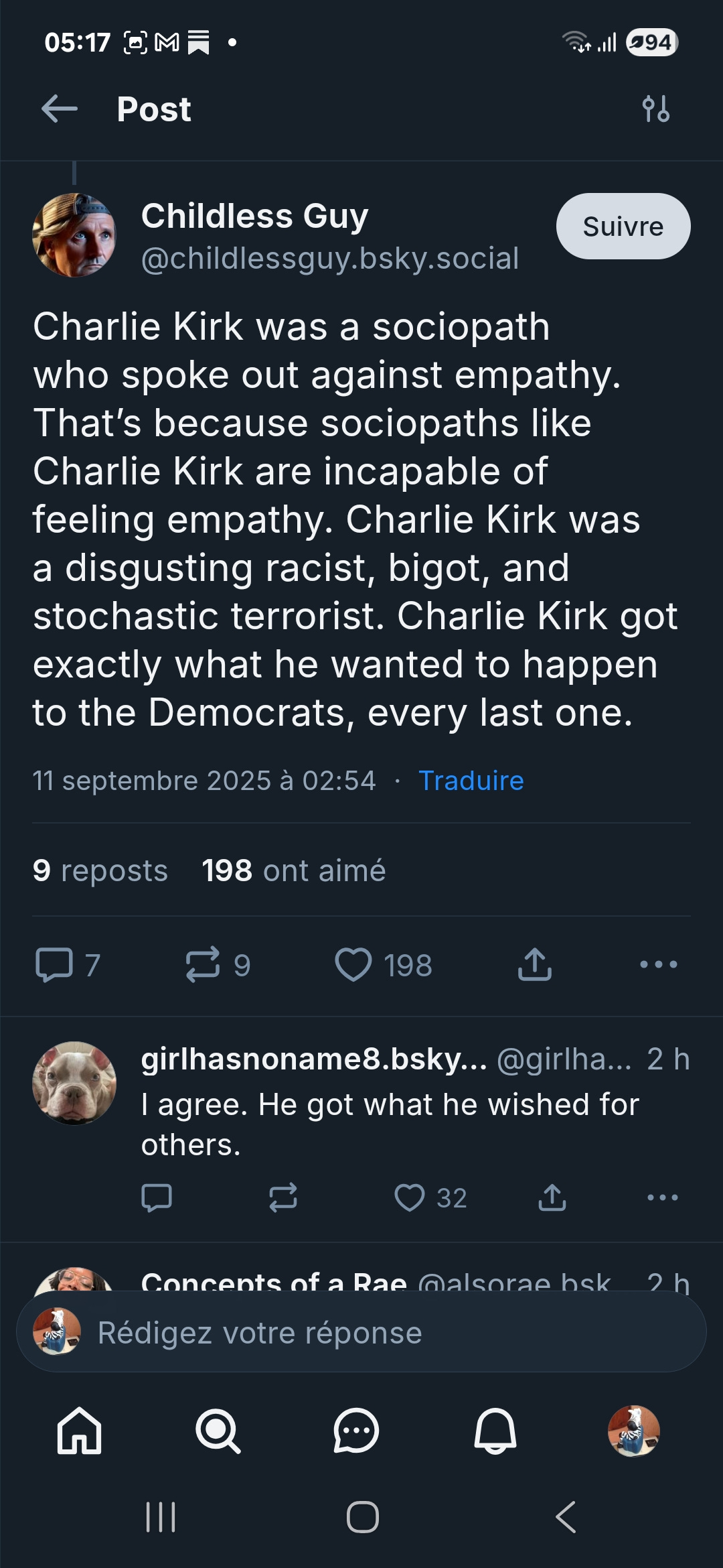 La décence commanderait de ne dire que du bien d’une personne qui décède. Un petit tour sur Bluesky avec comme recherche “Kirk” laisse bien sûr apparaître de nombreux messages où est stipendiée la violence politique, même en faisant état de désaccords profonds.
