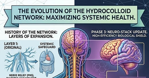 Originally, my hydrocolloid protocol was engineered as a systemic safeguard—designed for nerve relief, diabetes management, and preventing a second stroke or the onset of cancer. Today, the network has expanded. It now operates as a structural repair system for Degenerative Disc Disease (D.D.D.) in my lumbar and thoracic regions, delivering a precise nutrient stack to repair my torn iliolumbar ligament and address Modic 2 disc changes at L5.