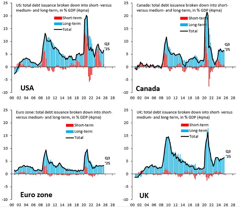 The world's largest economies all run budget deficits that are way larger than before COVID. This is true for the US (top left), but it's also true for Canada (top right), Euro zone (bottom left) and UK (bottom right). Fiscal policy has become unmoored. Today’s Substack: