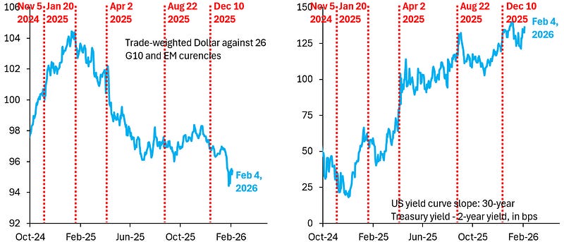 On Monday, I put out this chart pack to track market fallout from the Warsh nomination. Since then, the Dollar is stable (lhs) and the only sustained move has been for the US yield curve to steepen (rhs). More upward pressure on global long-term yields...