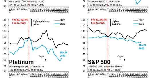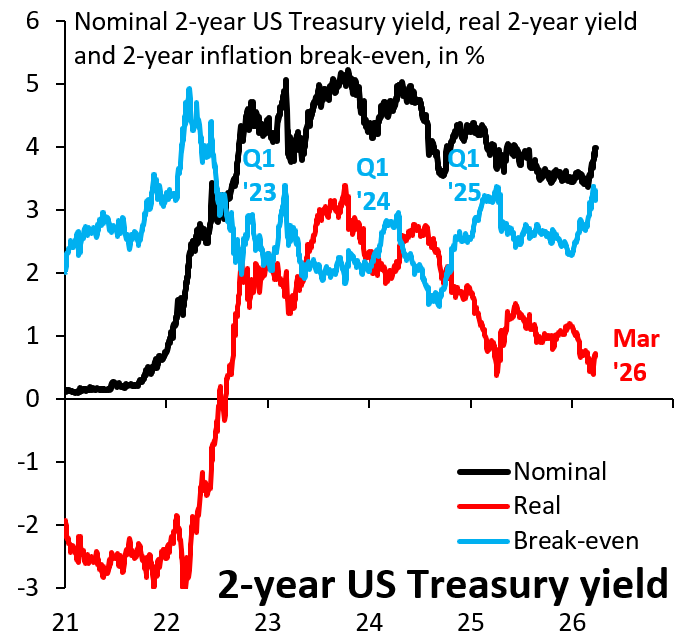 Many are attributing the fall in precious metals to rising real interest rates. That's wrong. Real rates (red) have fallen. The rise in nominal interest rates (black) is all about break-even inflation (blue) rising. That's fundamentally good for gold...