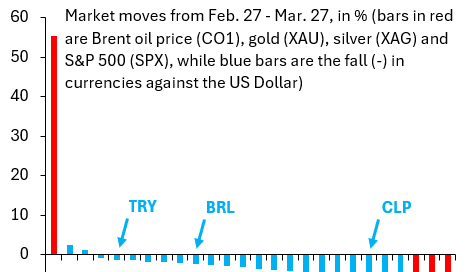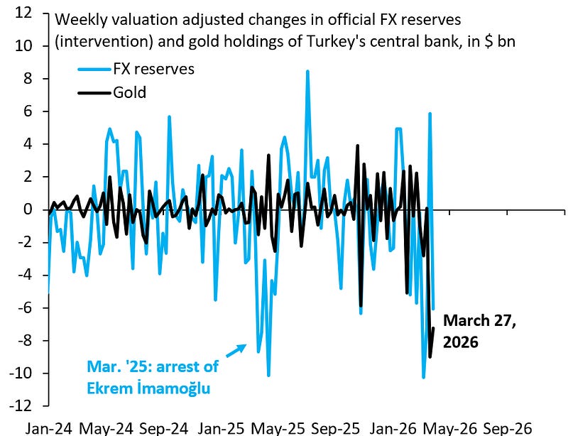 Factoring in gold, I estimate Turkey has intervened to the tune of $40 bn in March 2026 to defend the Lira. That's the same as in March and April 2025 after the arrest of Ekrem İmamoğlu, an episode that ended with a "step" devaluation of Turkish Lira...