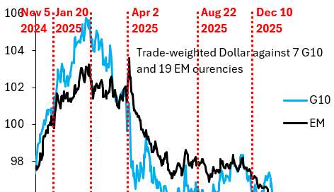The Brazilian Real today is strengthening sharply against the Dollar. $/BRL has fallen below where it was on Feb. 27, i.e. before the war with Iran began. The Real will now start a big strengthening cycle. Back to $/BRL fair value of 4.50 like in 2022...