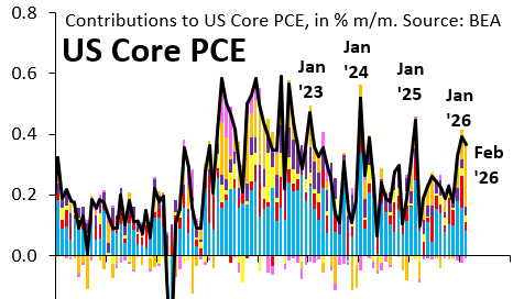 How bad is the US inflation picture? The spike in oil prices will push up March CPI later today, but - under the hood - inflation is well behaved. Yesterday's PCE reading for February showed core services inflation (blue) slowing. There's no overheating...