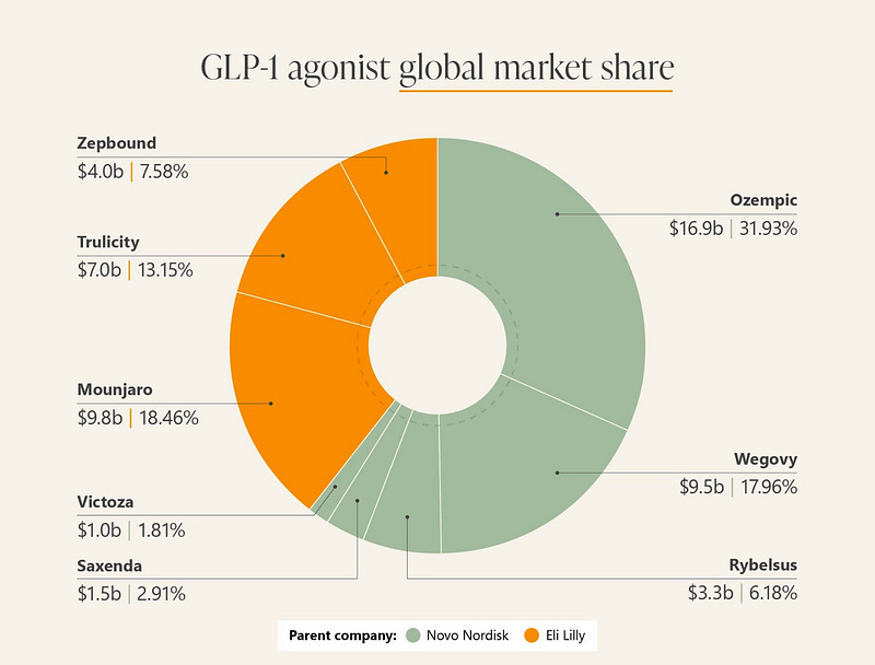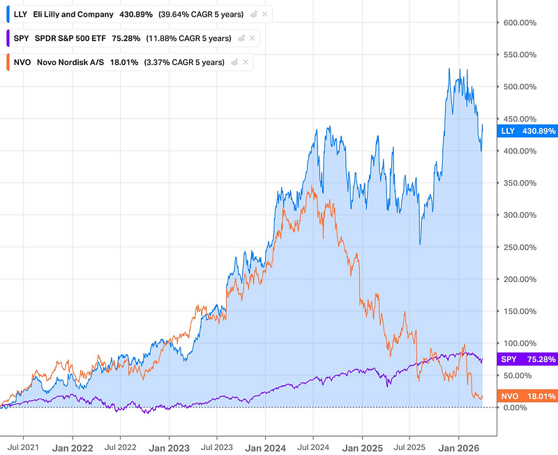 Share of the GLP-1 market by the duopoly that dominate the market (source: Source: creoclinic.com/blog/oze…) versus 5 year share price performance.