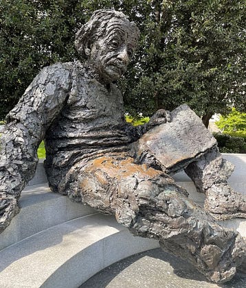 Just across Constitution Avenue from the Vietnam Veterans Memorial stands a wonderful memorial to Albert Einstein. Located on the grounds of the National Academy of Sciences, a massive four-ton bronze sculpture of the brilliant physicist sits on a series of low granite steps on an (of course!) circular dais.
