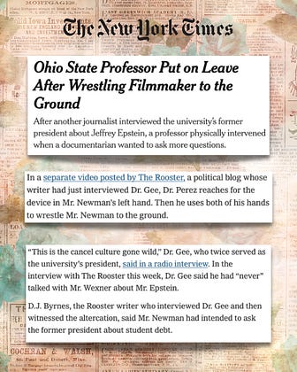The New York Times featured The Rooster's original reporting on Ohio State Assistant Professor Luke Perez's assault on Columbus documentarian Mike Newman, as well as Vice President E. Gordon Gee's shameless response to questions about Leslie Wexner and Jeffrey Epstein.