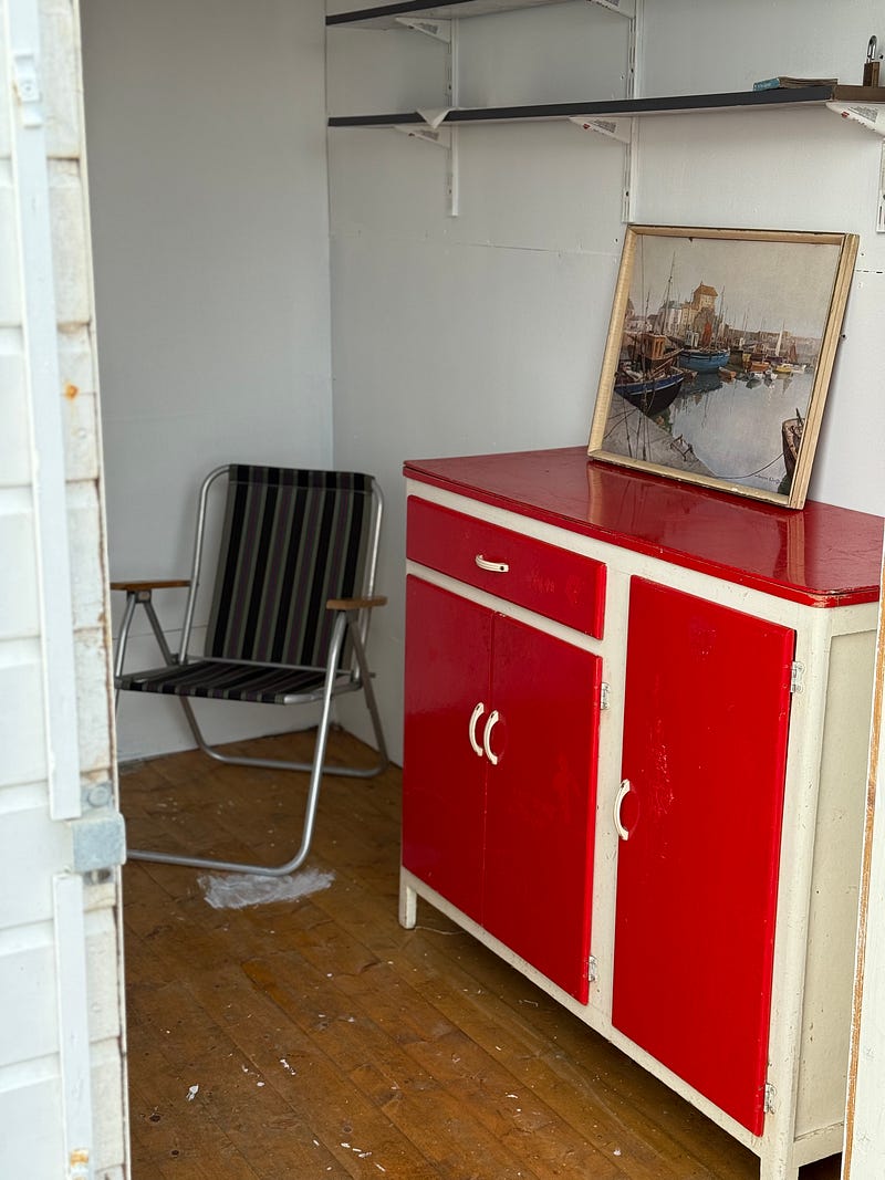 Our first pieces of furniture are in at the beach hut. A 30s kitchen unit bought for £30 from Facebook marketplace, and some metal deck chairs found at the local brocante. I love how it’s looking. The whole thing will be furnished with vintage and junk shop finds…