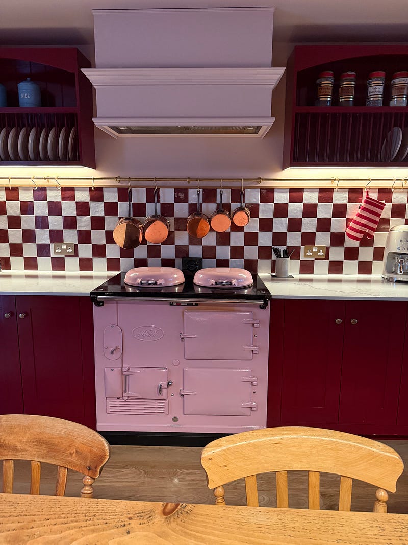I very much enjoyed the gorgeous pink Aga at Margate House, where a personal chef cooked an incredible full English breakfast for us in the morning. The pink/red combo reminds me of your book India Knight