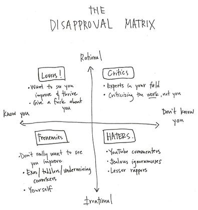 Anne Friedman’s Disapproval Matrix, for deciding whether to care about online criticism. “The general rule? When you receive negative feedback that falls into one of the top two quadrants—from experts or people who are engaging with and rationally critiquing your work—you should probably take their comments to heart. When you receive negative feedback that falls into the bottom two quadrants, you should just let it roll off your back and keep doing your thing.”