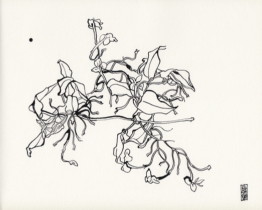 This is a drawing of a type I think of as ‘walking the tightrope’: start, keep going, keep going, keep going, finished. (As Klee famously said, ‘taking a line for a walk’.) Drawing this way feels trancelike. If you stop, you risk losing your flow and / or losing your way in the maze of detail. (I have a theory that botanical drawing provides the perfect level of complexity: only just graspable by the human mind. Drawings like this were traditionally a form of study. Every shape, every juncture, the particular texture of leaves and petals, every detail must be attended to in order to render with accuracy.)
