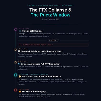 A statistician named Steve Puetz noticed the pattern and formalized it: major market crashes cluster around a window defined by a full moon falling within 6 weeks of a solar eclipse, especially when that full moon is itself a lunar eclipse.