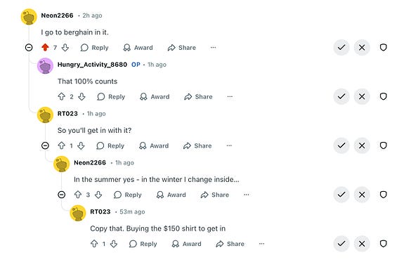 I love Reddit. Someone asked about wearing SATISFY for stuff other than running. Top reply: “I go to Berghain in it”. They should needlepoint that on a pillow in the office.