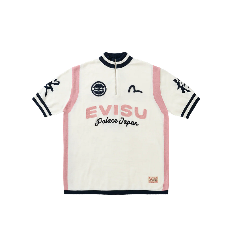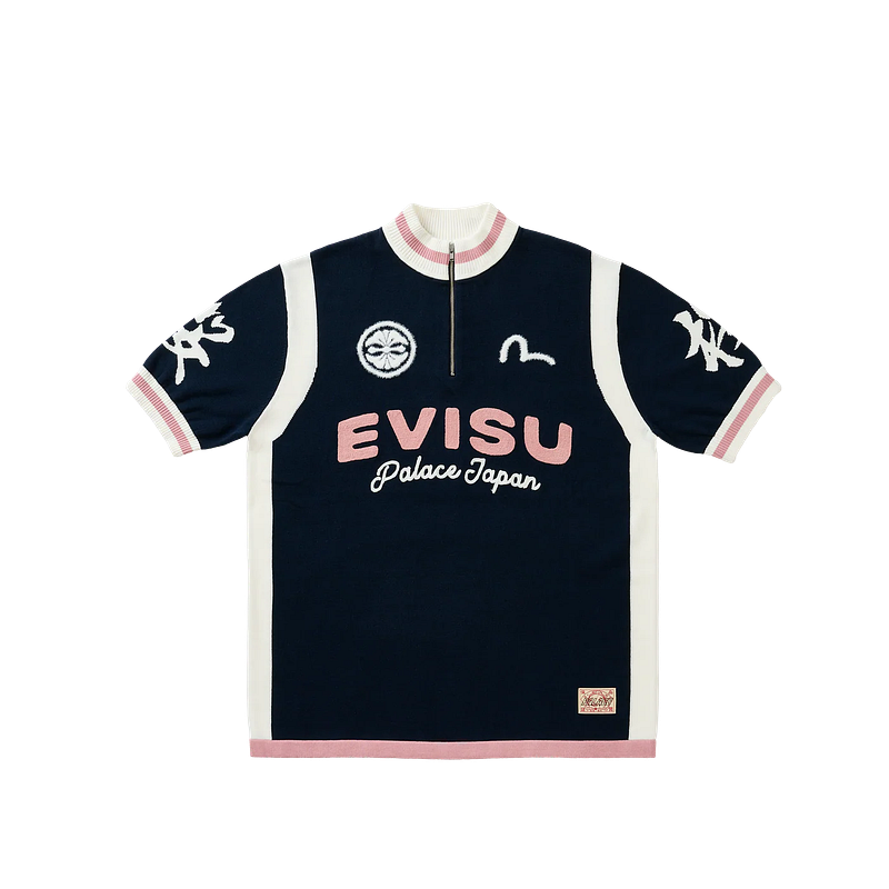 Missed these on Palace Skateboards, EVISU collab with them on a vintage quarter zip cycling jersey.