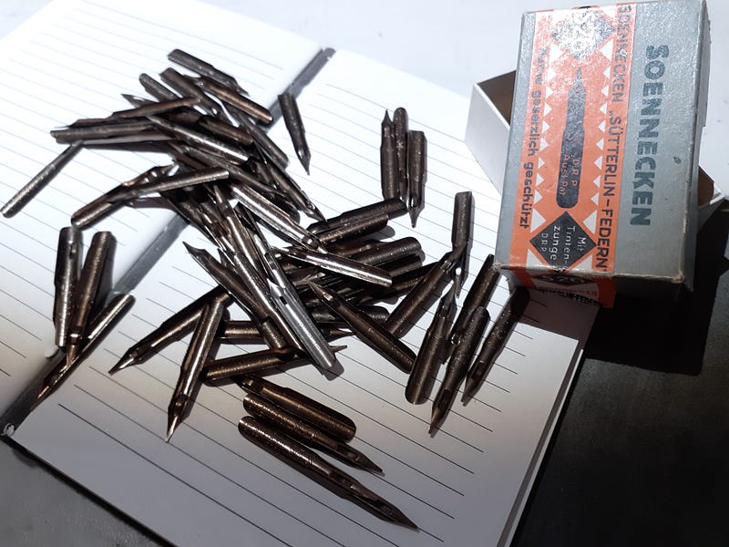 I still have two full boxes of perfect pen nibs from my Swiss grandmother (ca. 1920s). I often include a couple in the letters I send to subscribers who have kids, to pass on a bit of tangible history (and maybe even awaken an interest in calligraphy).
