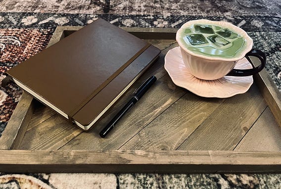 journaling with my orange-blossom (still experimenting with syrups) matcha latte in my new flower teacup! 🌸