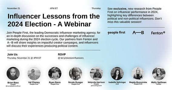 On Thursday, November 21, join People First for a discussion on the wins, challenges, and innovations in influencer marketing during the 2024 election cycle. Our partners from Fenton and A—B will be sharing behind-the-scenes strategies from impactful campaigns that successfully engaged influencers, while top creators will offer their perspectives on producing political content.