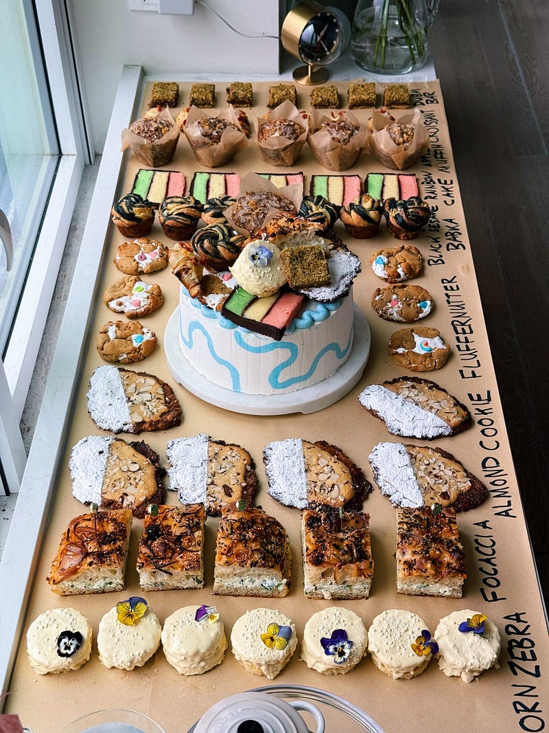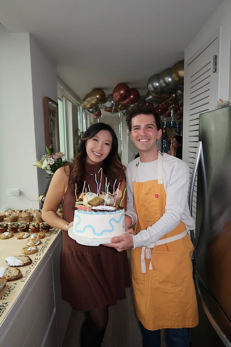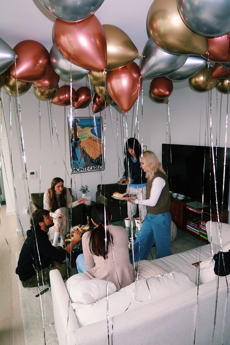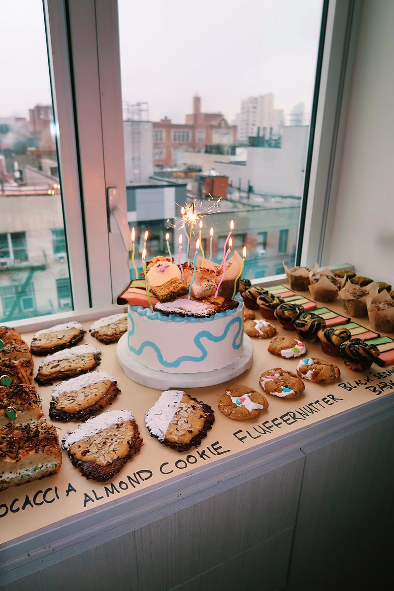 apartment café’s 1st birthday!! 🎈 capping off 1 whole year of apt cafes with a one-of-a-kind potluck cake, sparklers, and lots of chrome balloons ✨ full Substack and recipes are posted :)
