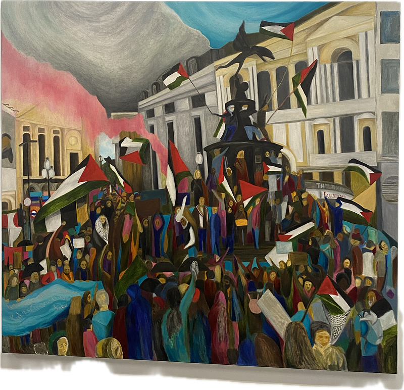 Aban Raza is an extraordinary artist who engages with the most difficult challenge—that of human beings who protest, be it farmers, be it members of a sangathan asserting the right to information, be it about Maruti workers striking or the protests against atrocities on Palestinians. Her work is showing in Delhi till December 15. She is raw talent with a big heart and the most vivid colours.