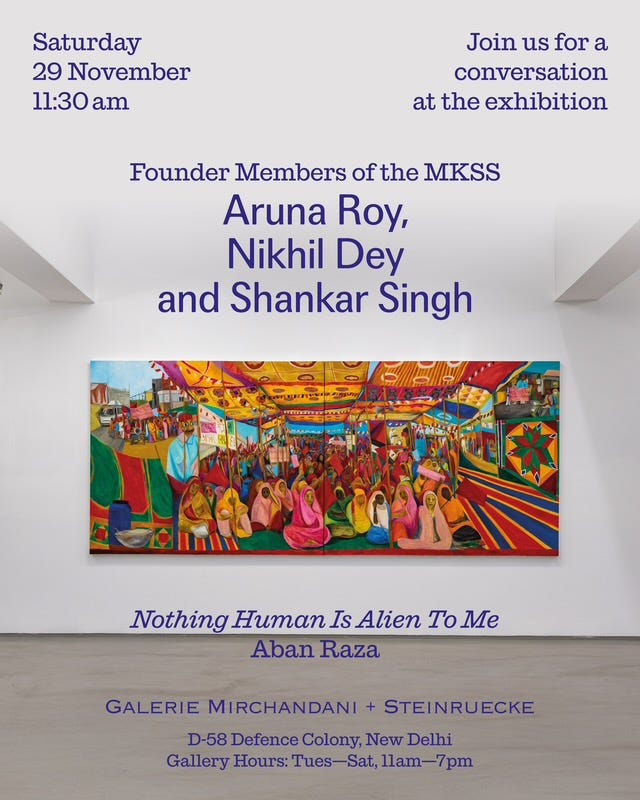 In this large wide canvas she captured the colours of Rajasthan, of the workers who are still gathering and registering that the RTI rights are being whittled down. What is a public that does not know—That is denied the right to know?