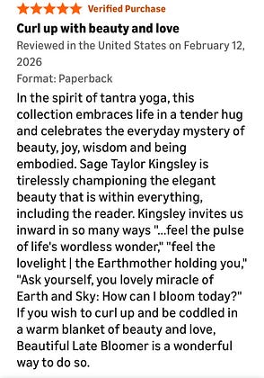 HUGE HAPPY NEWS!: Itβs Never Too Late to Bloom and Shine! β¨π»I just published my debut poetry collection at age 60: Beautiful Late Bloomer: Passionate Poetry & Mystic Musings. Iβve been writing poetry since age 9. Despite being housebound with ME CFS for over a year, I got it done. I went to an open mic yesterday to read my uplifting mystic love poetry! π€ππβ¨βπ½π»Woohoo!!! My first time reading at an open mic from my Published Book.π Reviews are rolling in. Iβm so happy!!!