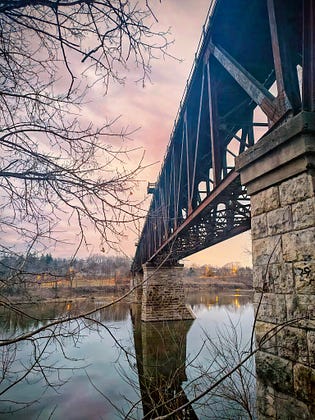 The river keeps the silt and rust the century left behind,