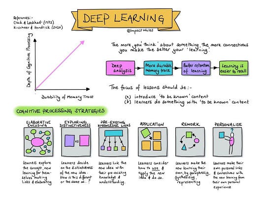 Education - When deep learning is required, people need time to explore, understand, and make connections. This is especially true when dealing with complex issues that involve many factors. For me, the π step is: how do you help learners turn what they've learned into real-life action and change. (sketch notes credits, Impact Wales)