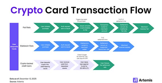 The vast majority of crypto card volume today settles via fiat rails. This remains the default because it requires no merchant integration. The crypto-to-fiat conversion happens before settlement to the payment network level, making the transaction indistinguishable from any other card payment by the time it reaches the network. Importantly, typical program managers a la Baanx’s Crypto Life and Bridge, do not handle settlement to their desired payment network, instead partnering with issuing banks such as Lead Bank and Cross River Bank who handle settlement, respectively. Full-stack issuance platforms like Rain handle settlement directly to Visa by liquidating stablecoins or crypto assets to the Visa network, which then routes the amount to the acquiring bank’s desired fiat currency. For the vast majority of crypto card usage, nothing from the merchant’s perspective changes.