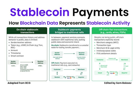 Public blockchains are transparent by design: every transfer, timestamp, and amount is visible. However, blockchains record how value moves, not why it moves. Wallets are pseudonymous, transaction metadata is minimal, and economically distinct actions can look identical at a transaction level. By contrast, traditional payment systems embed rich contextual metadata—merchant type, transaction purpose, reversals, settlement status—which allows intent to be directly observed.