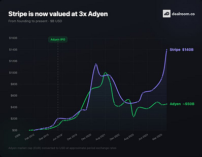 - Private market mechanics. Stripe remains privately controlled with constrained liquidity. Adyen trades publicly with full price discovery and quarterly scrutiny.